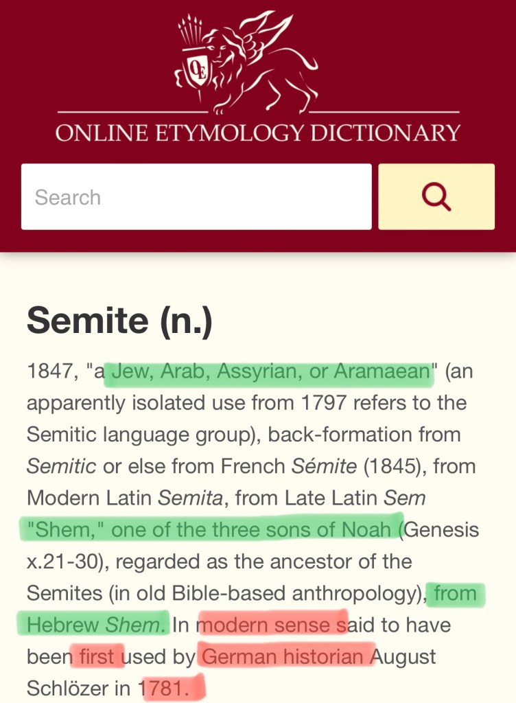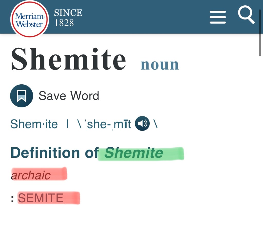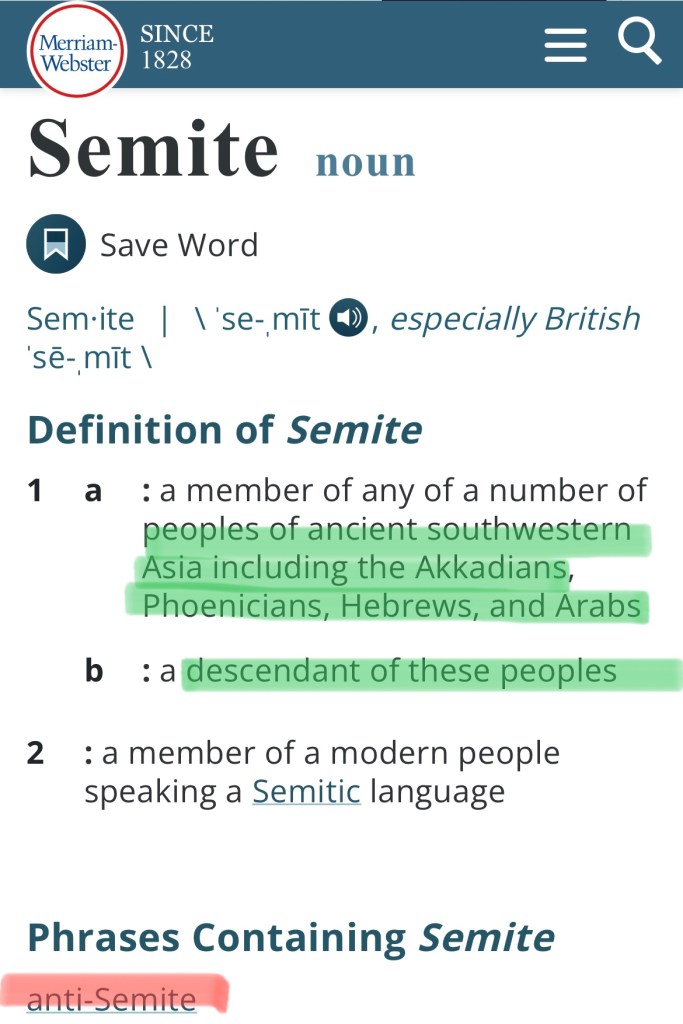 Collins English Dictionary above, defines it by stating at the very top that Semetic is “less commonly Shemitic” — we will go into that a little more later — but notice that Semitic/Shemitic deals with Afro-Asiatic languages; then further down in the 3rd definition they interestingly say “especially the Jews or the Arabs”, something else to keep in mind, Arabs by definition are included. Let’s look at another dictionary source to see how they define Semitic: