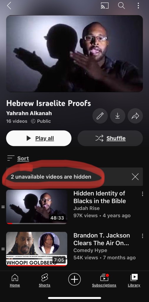 I’m disappointed to report that YouTube has once again removed two more exceptional videos from my “Israelite Proofs” playlist. These videos provided compelling responses to claims that people of African descent cannot be Israelites. Unfortunately, upon reviewing my playlist, I discovered that YouTube has “hidden” these informative videos. It is what it is… They can hate the truth but they can’t stop it!