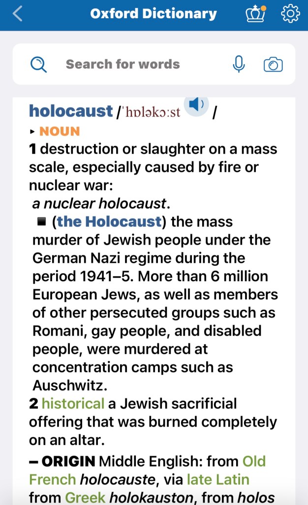 I’ve digressed a lot, so let us get back to the misuse of the word holocaust. And let’s finally look at the modern meanings that the English word definers give us to, as we drive this blog home: