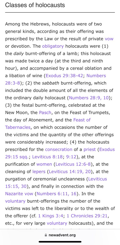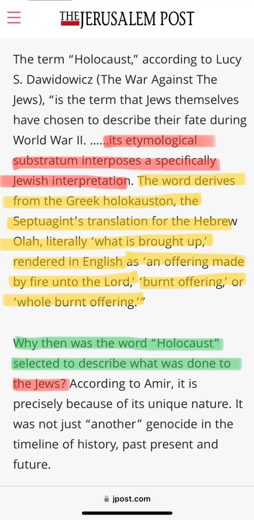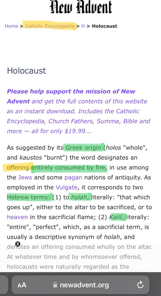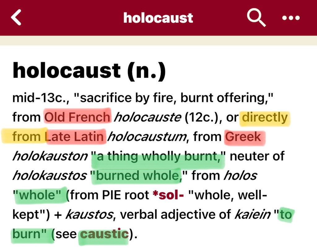 So… according to Etymonline, the word “holocaust” directly comes from the Greek, literally meaning “a thing wholly burnt”, hmmm… Ok. Let’s continue: