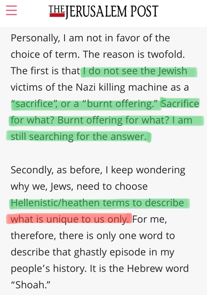 Ok, so after reading all of the above and checking the biblical verses for yourself, do you understand how and why “The Holocaust” which pertains to “Hitler’s Jewish Policies”, remains to be the word used by Ashkenazi Jews and the world? Do you have any idea why someone who says they are Hebrew, would want their people’s genocide to be considered as “a whole burnt offering”? No? Me either. Again, shoah/catastrophe is a much better word indeed, but I’m not alone in this understanding, let’s hear it from those in Jerusalem: