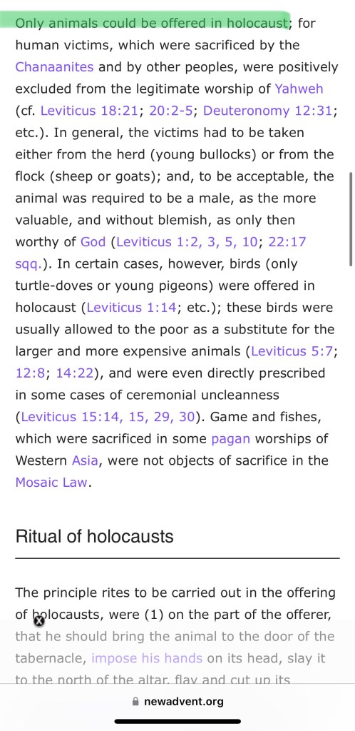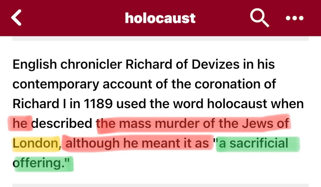 So now we also get the origin of the misuse of the word holocaust, and it dates back to 1189, how does it say that it was used? Well… It was meant to be used, not as a “massacre, or destruction of a large number of persons” but instead closer to the original meaning, being “a sacrificial offering” of the Jews in London (pre-Hitler). Again, the word holocaust, was not meant to be used to mean (according to the modern misunderstanding of the word as referenced in the previous highlight above states as), a “massacre, or destruction of a large number of persons”. Again, he used it to mean a sacrificial offering… So, an offering, to whom? A sacrifice, for what? Hmmm… well, alright then, let’s check another source, shall we?