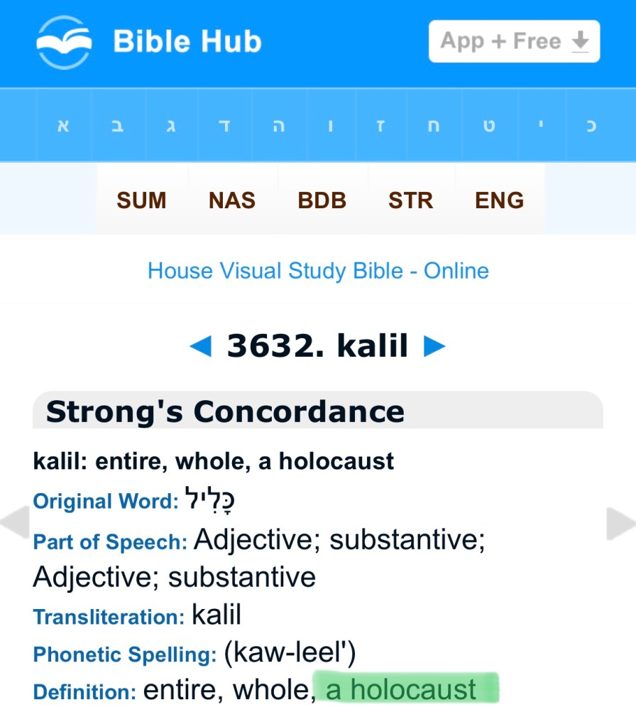 Ok, since it was made clear earlier, that the word holocaust has biblical connections, I’m glad to see a different source, actually looks at some Hebrew words & meanings. Quickly, let us check those Hebrew words by another source before we continue: