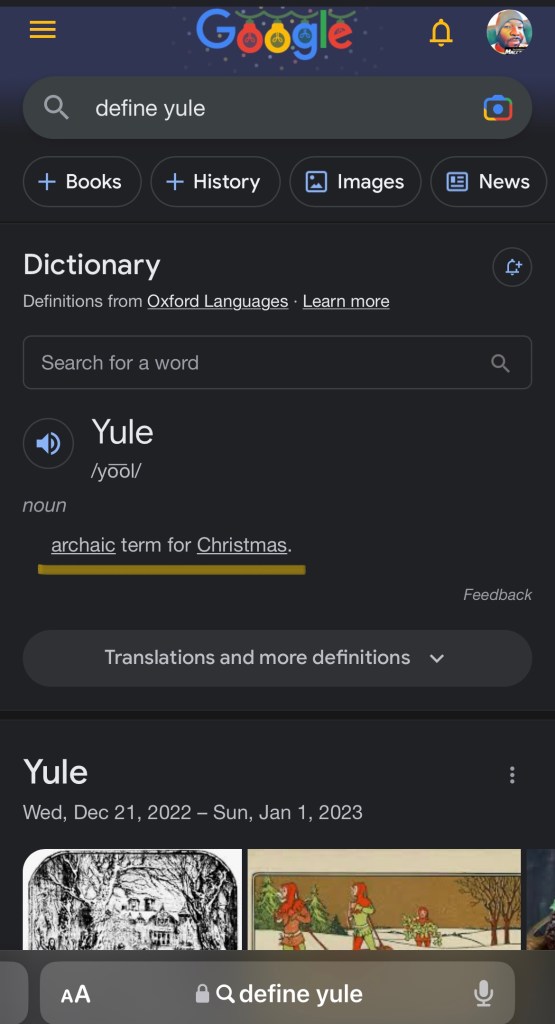 “Yule, festival observed historically by Germanic peoples and in modern times primarily by Neo-Pagans, coinciding with the winter solstice (December 21–22 in the Northern Hemisphere; June 20–21 in the Southern Hemisphere). The pre-Christianfestival originated in Scandinavia and was later subsumed, along with other pagan celebrations, into the Christian holiday of Christmas.”