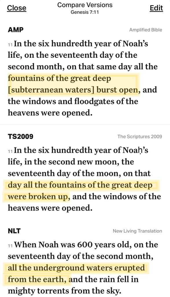 Consider this: when we read about YAH causing water to spring up from the ground, to water the earth (before the first rain fell from the heavens—Genesis 2:4-6); when we read about YAH causing fountains to spring flood waters up from the depths of the earth to flood the earth during the Great Flood (He didn’t just open the windows/floodgates of heaven and flood the earth with rain from above, but He caused primary water to flow up—Genesis 7:10-12); and when we read about YAH causing water to flow out of the rock as He did in the wilderness when He tested & provided water for our Israelite ancestors (YAH not only purified existing bitter water—Exodus 15:22-27, but even more miraculously He caused primary water to flow out of a rock—Exodus 17:1-7 & Numbers 20:8-13); then we can look at the spiritual water which can spring up from within us, knowing that it is a new creation, well of living primary water, which comes from and through the power of The Holy/Set Apart Spirit (John 7:37-39)! Read the fuller passages listed, and pay attention to these highlights and bonus verses!:
