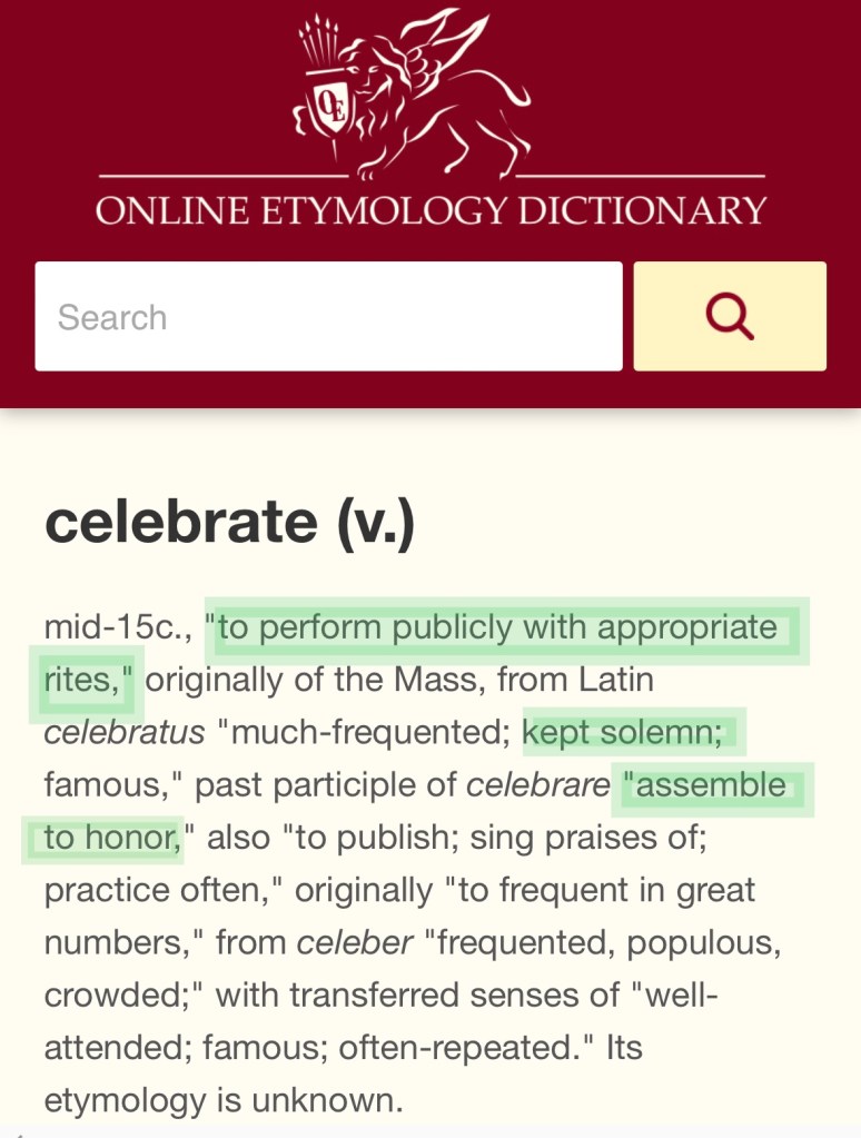 And to keep this short & sweet, for now, let us stick with the English (for a point) on this one today. What do you think is the origin of the English word “celebrate”? What comes to mind when you hear the word celebrate? Why & how do you use it? Normally, the word celebrate pertains to fun festivities, parties, happiness, etc… right? Well…let’s quickly check out the etymology:
