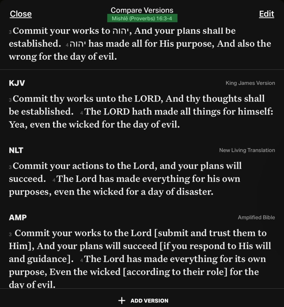 ”Commit your works to יהוה (YAH), And your plans shall be established. יהוה (YAH) has made all for His purpose, And also the wrong for the day of evil. Everyone proud in heart is an abomination to יהוה; Hand to hand: he goes not unpunished. By loving-commitment and truth crookedness is pardoned. And in the fear of יהוה one turns away from evil. When a man’s ways please יהוה, He makes even his enemies to be at peace with him.“