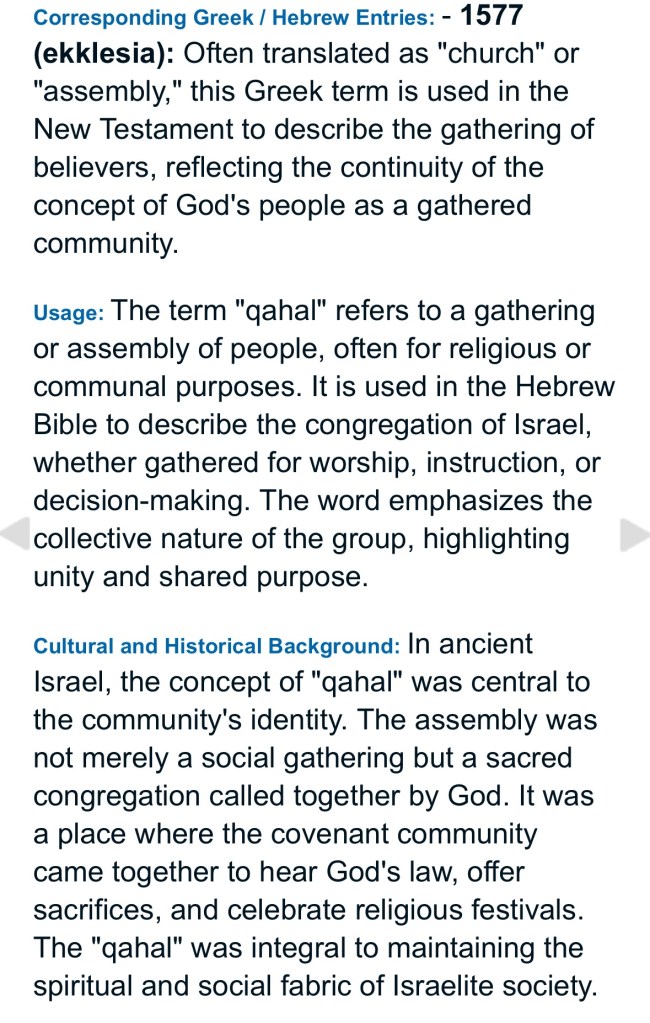 In the Tanakh (aka “Old Testament”) Scriptures, qahal refers to the assembly or gathering used to describe the congregation of Israel. This contextual usage of qahal first appears in Exodus 12:6 in reference to the gathering of the Israelites before the Passover. (And yes I know, qahal appears prior to the nation of Israel, but even the first mention references the nation that would come — Genesis 28:3)