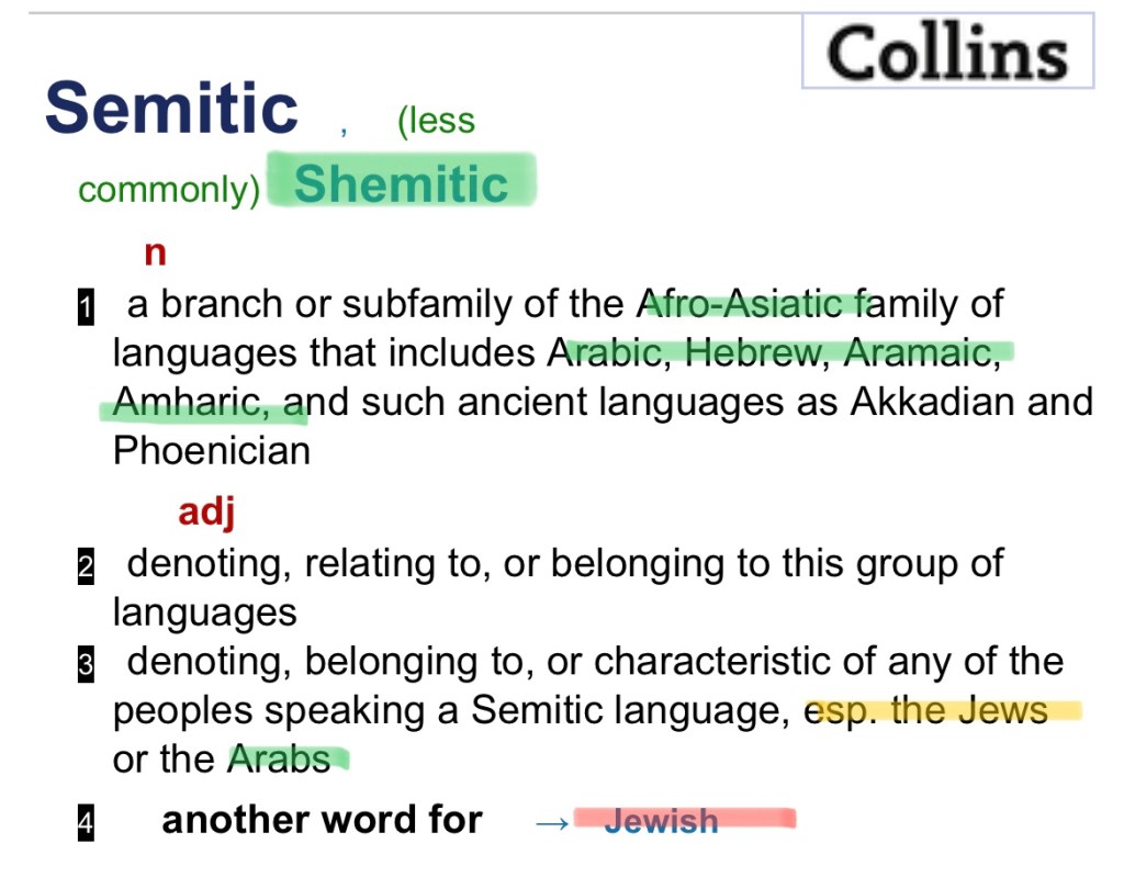 Collins English Dictionary above, defines it by stating at the very top that Semetic is “less commonly Shemitic” — we will go into that a little more later — but notice that Semitic/Shemitic deals with Afro-Asiatic languages; then further down in the 3rd definition they interestingly say “especially the Jews or the Arabs”, something else to keep in mind, Arabs by definition are included. Let’s look at another dictionary source to see how they define Semitic: